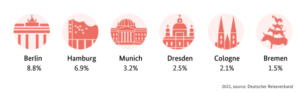 With a population of over 83 million, Germany is the most populous country in the EU and one of the most densely populated. Around 78 percent of the population live in densely or moderately populated areas, while around 32 percent live in major cities with over 100,000 inhabitants, of which there are 80 in Germany. The cities also attract many tourists. Berlin Berlin Once a year, during the Berlinale film festival, the world of the silver screen focuses its attention on Berlin. And the city’s inhabitants are used to global interest. After all, the people of Berlin have lived in a capital city since 1458. However, there is also a shady side to the city’s history… Read more › is a particularly popular choice and regularly sets new visitor records. A metropolis of 3.8 million people, it is one of Europe’s top tourist destinations, with 30.6 million overnight stays in 2024.